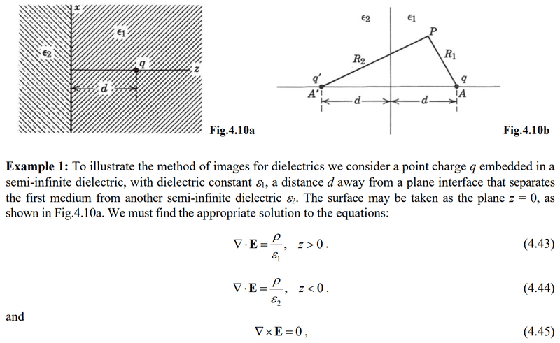 $$\\\\\Phi_{1}\left(z\right)\left|_{s=0,z>0}\right.=\frac{1}{4\pi\varepsilon_{1}}\left(\frac{q}{d-z}+\frac{\left(\varepsilon_{1}-\varepsilon_{2}\right)}{\left(\varepsilon_{1}+\varepsilon_{2}\right)}\frac{q}{d+z}\right) \\\\E_{1}\left(z\right)\left|_{s=0,z>0}\right.=-\nabla\Phi_{1}\left(z\right)\left|_{s=0,z>0}\right.=-\frac{d\Phi_{1}\left(z\right)\left|_{s=0,z>0}\right.}{dz}=\frac{1}{4\pi\varepsilon_{1}}\left(\frac{\left(\varepsilon_{1}-\varepsilon_{2}\right)}{\left(\varepsilon_{1}+\varepsilon_{2}\right)}\frac{q}{\left( d+z \right)^{2}}-\frac{q}{\left( d-z \right)^{2}}\right) \hat{z}$$