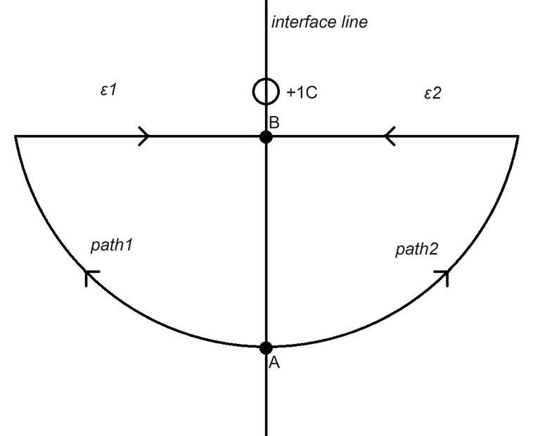 Consider a scenario in the picture where one half of space consists of a material with permittivity ϵ1 and the other half consists of a material with permittivity ϵ2, where ϵ1 > ϵ2. A unit positive charge is fixed at the interface between the two materials. Path1 is entirely within the material with permittivity ϵ1 and Path2 is entirely within the material with permittivity ϵ2. The paths are reflectively symmetric, with the interface acting as the mirror line. Just for simplicity, also assume the arc part of the both paths is perpendicular to the electric field comes from the fixed charge so they don't contribute to the work. Does it still require the same amount of work to move a unit positive charge from point A to point B along Path1 and Path2?
