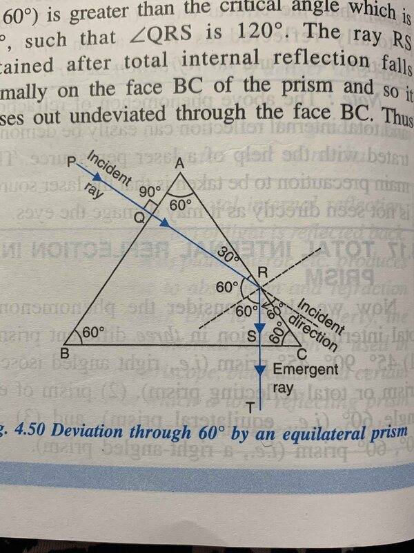 Prism equation - i+e = A+δ, where, i is angle of incidence, e is angle of emergence, A is angle of the prism and δ is angle of deviation. The case of normal incidence that I am referring is to, is as in the diagram.View attachment 266986
