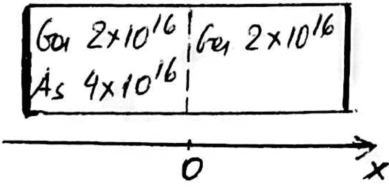 - Suppose that we have a Si speciment and there are Ga atom impurities of $2*10^{16} \text{cm}^{-3} $.`Then, at the left side we insert As impurity atoms of $4*10^{16} \text{cm}^{-3}$. A pn junction is created. What are $N_D$ and $N_A$ at each side of the junction?
