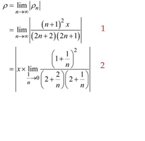 I would like to understand how the limit was changed in the ratio test from step 1 to step 2 in the image that I've posted. I thought that the denominator would look like (2/n+2)(2/n+1) in step 2 since it looks like we are just turning the n's into reciprocals. Any help here would be greatly appreciated. Thank you very much as always.