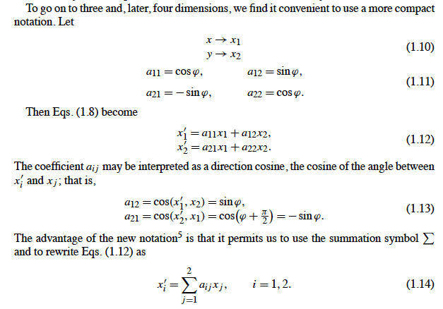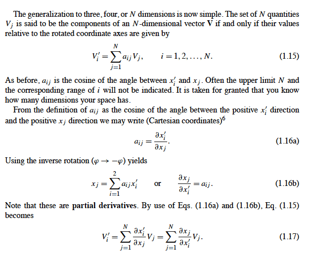 The thing that I'm confused about is that it says "As before, aij is the cosine of the angle between x′i and xj ." This is from rotating the coordinates, so x' is the new coordinates whilst x is the old one. And then it defined aij as the partial derivatives of the x'i wrt xj...Now I don't know how the cosine of the angle between x'i and xj is equal to the partial derivative. Can anyone explain this to me? Thank you in advanced!