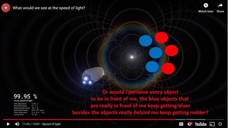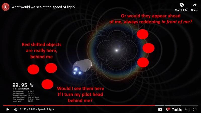 - Where would Doppler red shifted objects get perceived within the searchlight (headlight) effect of relativity, in front or behind the relativistic frame?