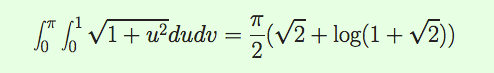 The discussion focuses on solving a double integral related to the surface area of a parametric surface. The user successfully computed the cross product but struggled with the double integral. The solution provided involves evaluating the integral as follows: $$\int_0^{\pi}\ \int_0^1\sqrt{1+u^2}du\ dv=\pi \int_0^1\sqrt{1+u^2}du$$, indicating that the inner integral simplifies to a constant, allowing for straightforward evaluation of the outer integral.