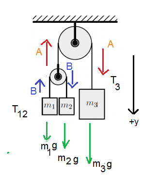 The discussion revolves around a double pulley Atwood machine involving three masses. Participants are exploring the dynamics of the system, focusing on the relationships between the masses, tensions, and accelerations of the components involved.