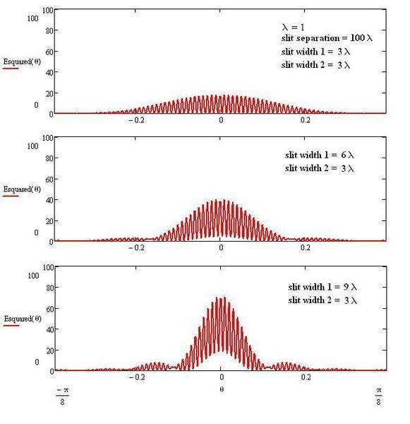 So expanding the slit will increase the amplitude of the transmitted wave and it will make the wave along the primary axis more like the original wave. I would expect that the measured intensity would become asymetrical. Attached are my results, but my results are against a flat plane of 100 wavelengths from the screen. The width of the plane encompasses the pi/4 radian beamwidth that buffordboy24's simulation did. Amplitude won't change the points of inteference, but it will change the amplitude of the total wave at that point. The fields will drop off at around 1/r