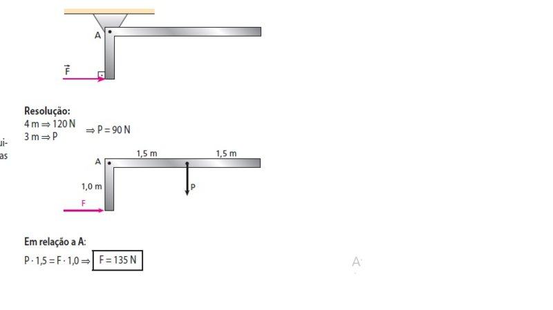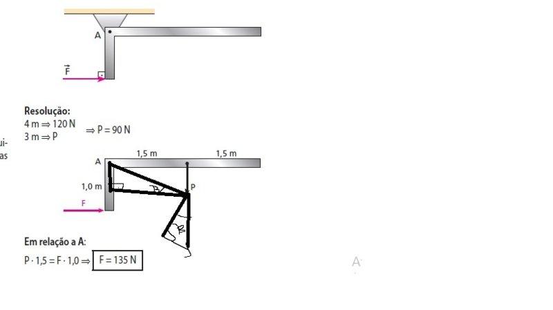 In the following figure we have an homogeneous L-shaped bar that has weight 120N. It's articulated without friction at point A. It's vertical part has length 1m and its horizontal part has length 3m. Find the intensity of F that maintains the bar in equilibrium.