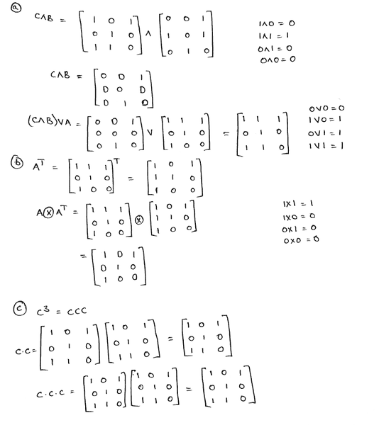 Some participants have provided feedback on each other's answers, noting discrepancies and suggesting areas for clarification. There is an ongoing exploration of how Boolean arithmetic should be applied in the context of matrix multiplication, with no clear consensus reached yet.