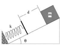 A 3.5 kg block starts at rest and slides a distance d down a frictionless 28.0° incline, where it runs into a spring. The block slides an additional 21.0 cm before it is brought to rest momentarily by compressing the spring, whose spring constant is 435 N/m.
