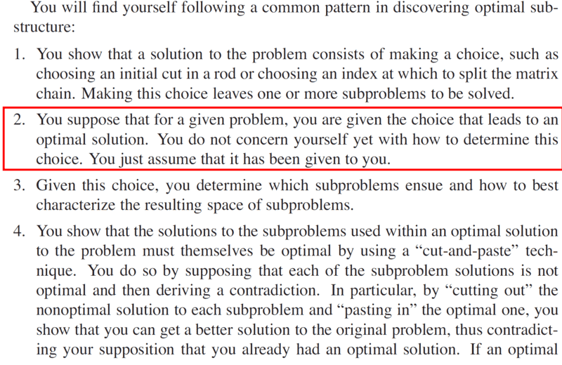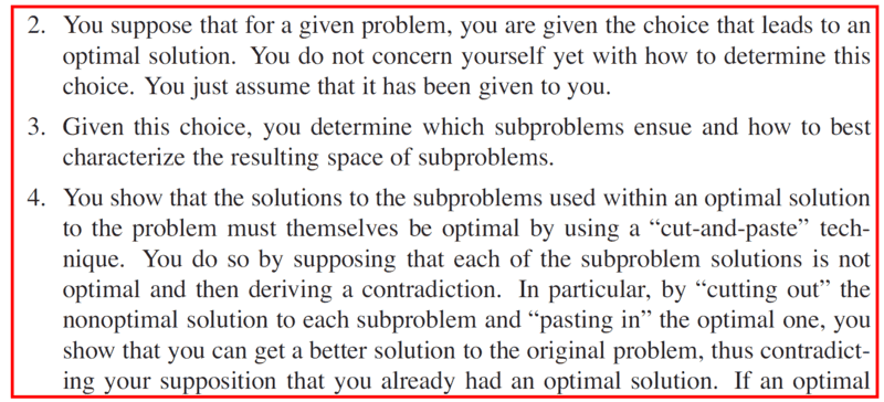 but I have no idea how to continue, how would you proceed to formally proving steps 2+3+4 ( which is proving an optimal substructure exists for the problem )?