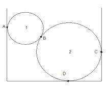 Determine the reaction forces at the four contact points A,B,C,D. The hollow balls which are homogenous and made of the same material have masses of 1.02kg and 2.04kg and the chamber they sit in is 55.98cm wide. Everything is smooth,so that the friction is negligible.