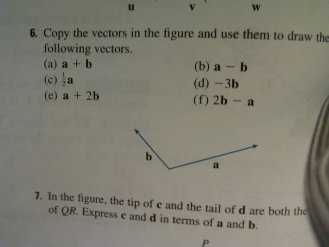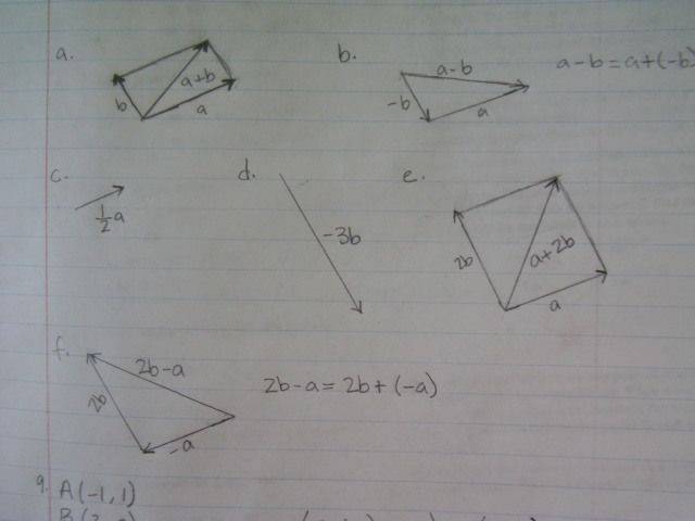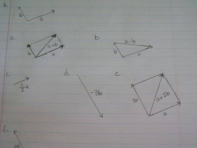 - One participant suggests that part (f) can be approached by flipping vector a to -a and connecting it to the tail of 2b, which is drawn twice in length.