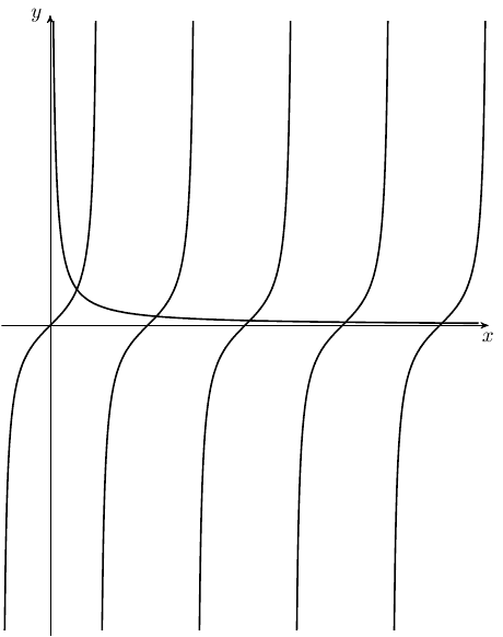 Is there a command to tell it to label every pi/2 on the graph?Evgeny.Makarov said:Code:\usetikzlibrary{arrows} \begin{tikzpicture}[>=stealth',x=.5cm,y=.5cm] \def\npi{3.1416} \def\periods{4} \draw[->] (-\npi/2,0) -- ({(\periods+.5)*\npi},0) node[below] {$x$}; \draw[->] (0,-10) -- (0,10) node[left] {$y$}; \clip (-\npi/2,-9.8) rectangle ({(\periods+.5)*\npi},9.8); \draw[thick,domain=0.05:{(\periods+.4)*\npi},samples=300,smooth] plot (\x,1/\x); \foreach \n in {0,...,4} \draw[thick,shift={(\npi*\n,0)},domain=-\npi/2+.1:\npi/2-.1,samples=100,smooth] plot (\x,{tan(\x r)}); \end{tikzpicture}