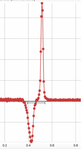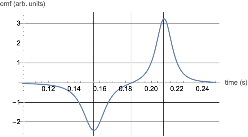 Here is also a graph of what one trial of dropping the magnet at 0cm above the top of solenoid (5.4cm above the centre) looks like (emf vs. time)