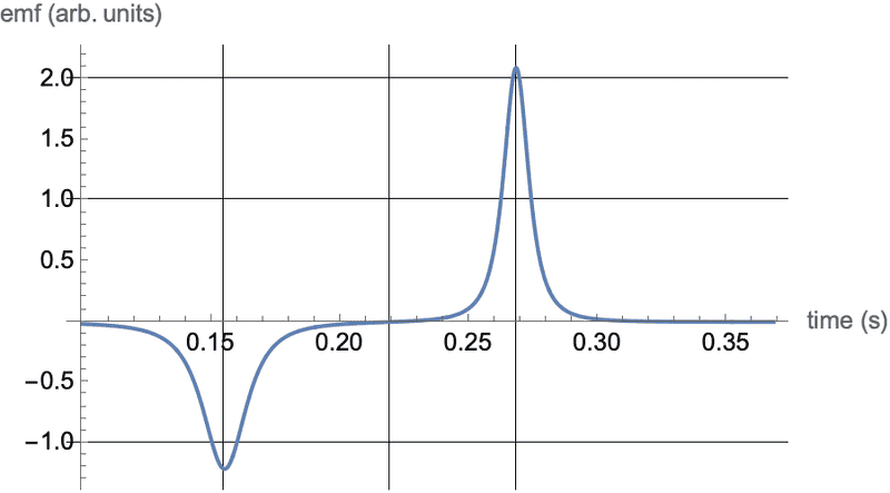 Note that the signal from the observer's ring is essentially zero when the dipole is farther than 2 solenoid diameters (##4a##) in either direction. That could be construed as defining the size of the SOI. The spatial profile can be viewed as voltage wave traveling down the solenoid with propagation speed ##v=v_0+gt##.