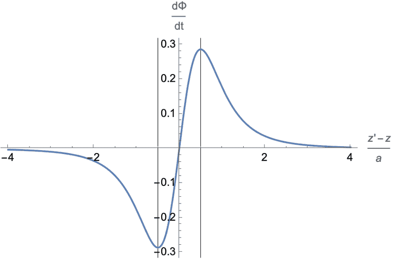 I have additional thought to enhance my previous message #37 regarding the sphere of influence SOI of the falling dipole. Consider an observer at a fixed location ##z'## relative to the origin in the middle of the solenoid. The plot below shows the spatial profile of the emf contributed by the ring next to the observer when the dipole is at location ##z##. The abscissa, ##\frac{z'-z}{a}## is the distance from the observer's ring to the dipole in units of the solenoid radius ##a##. Apart from various constants. the spatial dependence of the emf is given by $$\frac{d\Phi}{dt}=\frac{\zeta}{\left(1+\zeta^2\right)^{5/2}}~~~~\left(\zeta \equiv \frac{z'-z}{a}\right).$$ This function has extrema at ##\zeta=\pm\frac{1}{2}## and is shown below. The vertical gridlines mark the extrema.