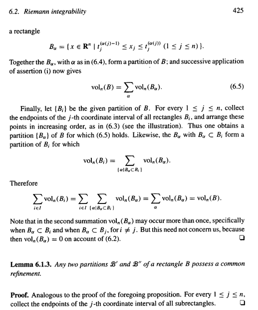 ... that is I do not see how the volumes of [itex]B'[/itex] and [itex]B"[/itex] which together comprise the overlapping rectangles [itex]B'_1 , B'_2 , B"_1 \text{ and } B"_2[/itex] satisfy (*) ...Can someone explain how (*) can be true given my analysis above ... I must be making some errors ...NOTE: I know that (6.2) in the text in defining the conditions for a partition of a rectangle Duistermaat and Kolk write
