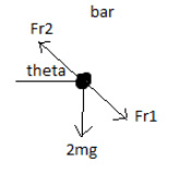 ##F_{r1}## is the force of the bar on weight 1, ##F_{w1}## is the force of the wall, ##F_{w2}## is the normal contact force on weight 2, ##F_{r2}## is the force of the bar on weight 2. The directions of these forces was worked out by considering the direction of the net force acting on each weight. Theta is the angle that the bar makes with the horizontal at time t.