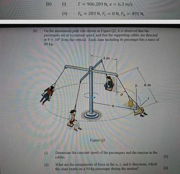What I have done is make a free body diagram that includes the tension of the cable and the weight of the rider/swing. So according to my calculations for part i: