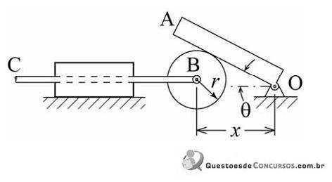 - The angular movement of the OA bar, shown in the figure above, is controlled by the horizontal movement of the BC axis, which moves from left to right within the guide. BC velocity is constant and equal to 3 m/s. At the instant shown in the figure, the distance between the center of the disc and the bar joint is x = 2 m. The disk with radius r = 1 m rolls without sliding on the bar OA. With regard to this mechanism, judge the following items: