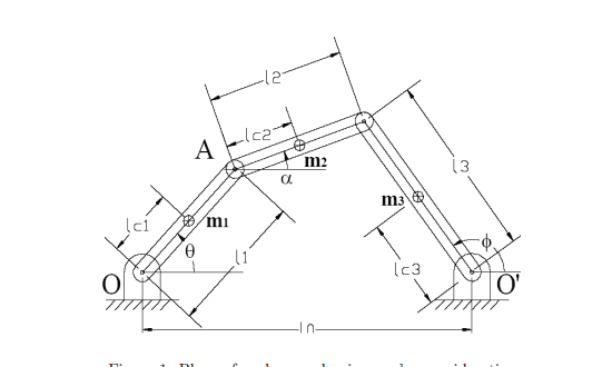 The attached figure is a four bar link. Each of the four bars has geometry, mass, moment of inertia, etc.