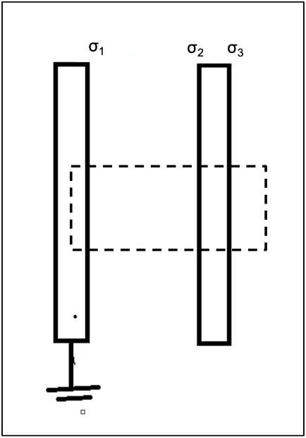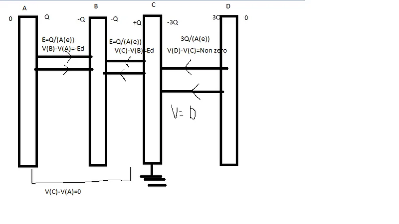So, we know that since the 3rd plate is grounded that means the potential from the right side of the third plate to infinity should be 0, i.e no work should be required to bring a test charge from infinity to the right side of plate 3.