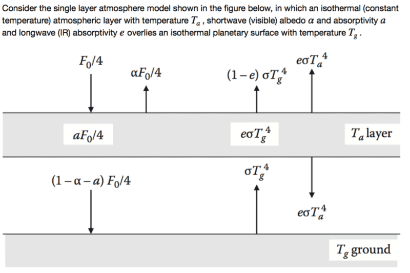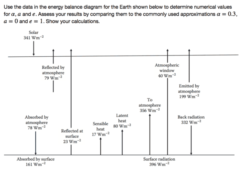 Use the data in the energy balance diagram for the Earth shown below to determine numerical values for α, a and e. Assess your results by comparing them to the commonly used approximations α = 0.3, a = 0 and e = 1. Show your calculations.