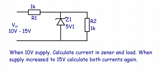 The discussion revolves around calculating the current through a zener diode and load in a circuit with varying supply voltages of 10V and 15V. Participants explore the implications of using the correct zener voltage in their calculations and the conditions under which the zener diode operates effectively.