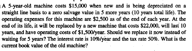 When comparing the old machine and the new machine, I found ##PV_{old} = $516.9##, and ##PV_{new} = $614.4##, so it would mean the new one is presently worth more. I used ##n_{t,old} = 5## and ##n_{t,new}=10##. ##C_{D} = C_{I}-C_{S}## where ##C_{I}## is the initial cost, and ##C_{S}## is the salvage value. However, I am not sure how I should incorporate operating expenses in my calculation, which leads me to believe what I am doing is incorrect.