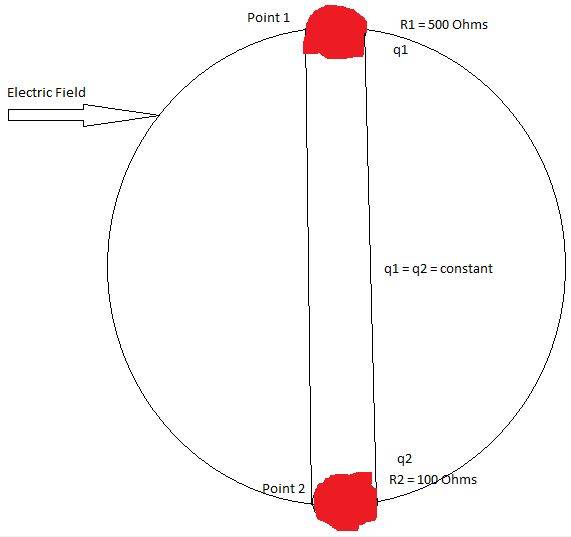 As per Ohm's law V = IR. In the above scenario there is greater resistance at point 1 then there is at point 2 (as shown on the diagram). The charges (q1 and q2) and so the current flowing through both points are the same.