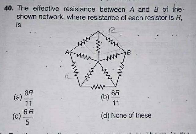 The discussion revolves around calculating the effective resistance between two points in a circuit involving multiple resistors arranged in a symmetric configuration. Participants explore the implications of symmetry in circuit analysis and the validity of removing certain resistors based on their positions in the circuit.