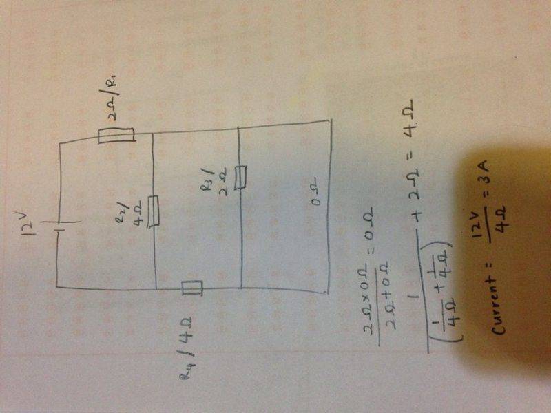 The effective resistance of the given circuit is determined to be 4 ohms, contrary to the initial claim of 4.4 ohms. The calculation involves the formula 1/(1/6 + 1/4) + 2, which simplifies to 4 ohms when R3 is omitted due to being shorted by a wire. The presence of a 0 Ω resistor in parallel with a 2 Ω resistor further confirms that R3 does not contribute to the overall resistance. This conclusion is supported by the understanding that the potential difference across R3 is negligible, resulting in minimal current flow through it.