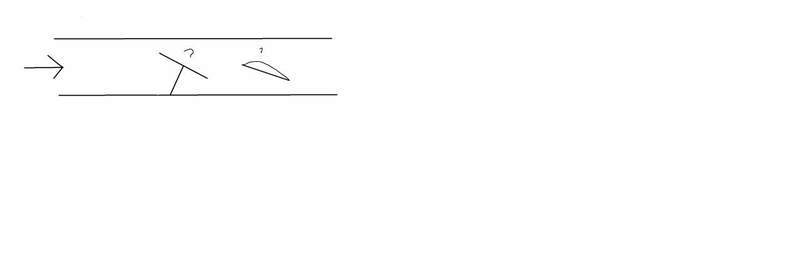 The first wing you see is an auto gyro rotor at an angle, the second is a conventional airfoil. The arrow represents the direction of the airflow in the enclosed tube. The marks you see are simply question marks, oops.