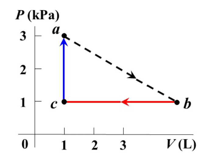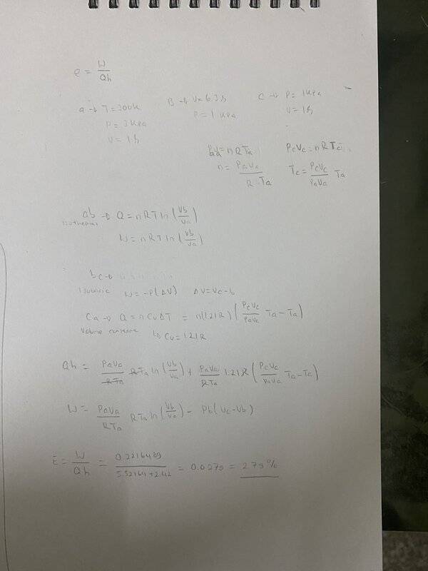 (hint: find the total net work (W) done, and identify the processes (ab and ca) in which the gas absorbs a total amount of heat Qh. The efficiency is then W/Qh.