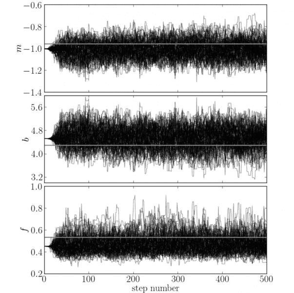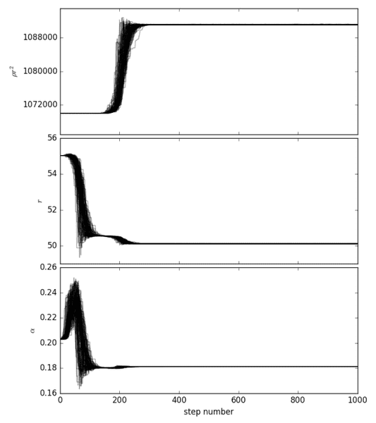 Hello I use a python package called emcee to fit a function to some data points. The fit looks great, but when I want to plot the value of each parameter at each step I get the plot.png below. In their example (with a different function and data points) they get the plot1.png image. Why is my function converging so fast, and why does it have that weird shape in the beginning. I apply MCMC using likelihood and posterior probability. And even if the fit looks very good, the error on parameters of function are very small (10^10 smaller than the actual value) and I think it is because of the random walks. Any idea how to fix it?