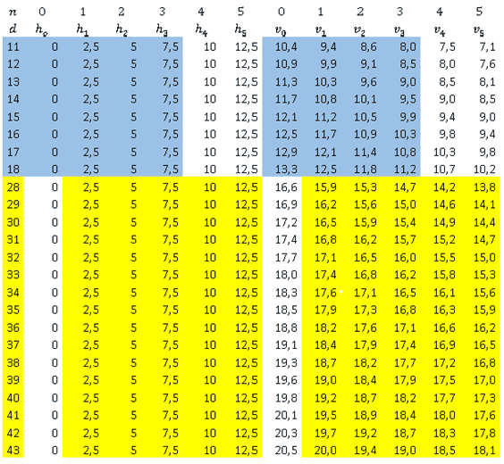 Table 1. Each height and velocity is calculated for various values of ##n##. The blue marked part of the table refers to house number 5 for ##d## within the range ##11≤d≤18##. We count from the ground floor of the house to the third floor and are therefore only interested in values of n from zero to 3. The yellow marked part of the table refers to the houses 14/16 where the throw length is within the range ##28≤d≤43##, where we are interested in values on n from 1 to 5.