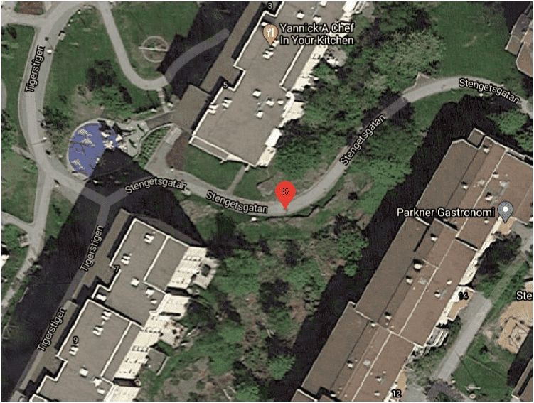 During the winter season, a few of my neighbour had eggs thrown at them as they passed the street. Each attack occurred at the same place (see the red dot on the map) but with no apparent individuals in the vicinity. The egg thrower is tossing the eggs from indoors och probably from some of the windows marked as green on the map. The area painted red designates where the egg cannot have been thrown since there are no openable windows and dense vegetation in the way. The houses number 5 has three floors and the houses 14/16 has 4 floors and are also stationed 2,5m above the road. Figure 1 is to the given scale.