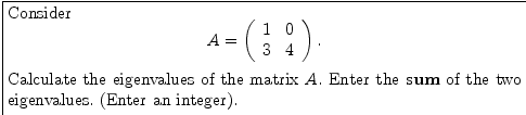 The eigenvector calculations for the equation y1 + y2 = 5 are confirmed as correct, with the characteristic polynomial derived as det(yI - A) = 0, leading to (y - 1)(y - 4) = 0. The eigenvalues of the triangular matrix are 1 and 4, which sum to 5, consistent with the trace of the matrix. The discussion emphasizes the utility of using the trace to simplify eigenvalue calculations without the characteristic polynomial, although the latter is straightforward in this case. Wolfram Alpha (W|A) corroborates these findings for the matrix ((1,0),(3,4)).