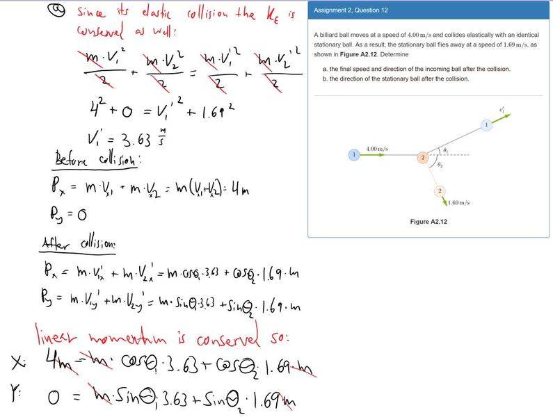 A billiard ball moves at a speed of 4.00m/s and collides elastically with an identical stationary ball. As a result, the stationary ball flies away at a speed of 1.69m/s, as shown in Figure A2.12. Determine: