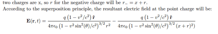 The discussion centers on the electric and magnetic fields generated by two point charges, q and -q, moving in opposite directions with velocity v. Participants clarify that the superposition principle applies, leading to a doubling of the electric and magnetic fields at the field point when both charges are considered. However, confusion arises regarding the mathematical expressions for the fields, particularly the magnetic field, which some participants initially miscalculate as quadrupling instead of doubling. The conversation emphasizes the importance of formal calculations and accurate representations of the field lines in relation to the charges' positions and velocities.