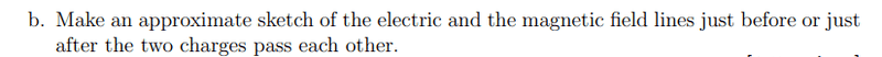 The discussion revolves around the electric and magnetic fields generated by two point charges, one positive and one negative, moving in opposite directions. The participants explore the implications of their motion on the fields, particularly at the moment they cross each other at the origin.
