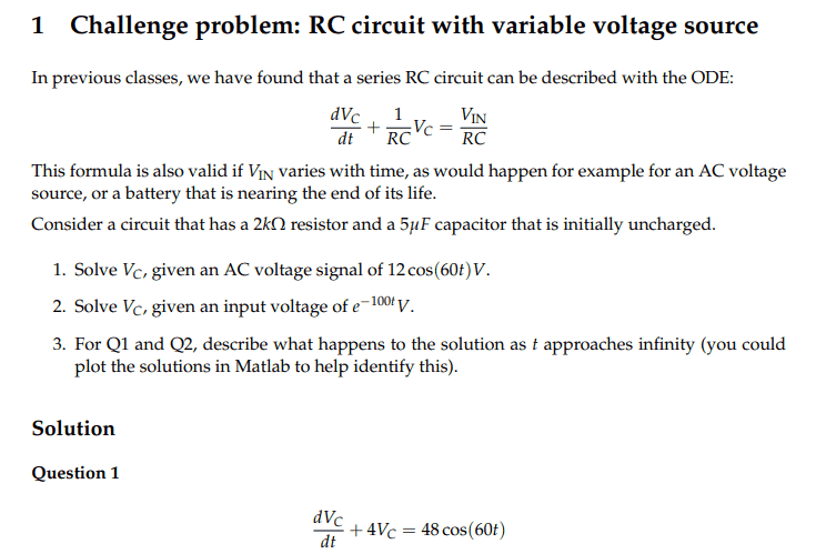 The discussion revolves around a first-order differential equation related to an electric circuit, specifically focusing on the terms 4Vc and 48 cos(60t) and their derivation from given circuit parameters.