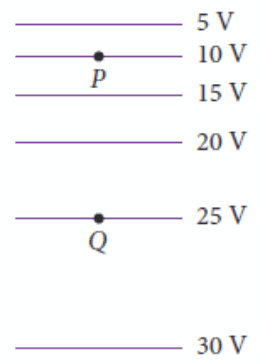 - In the figure (attached), the lines represent equipotential lines. A positive point charge is placed at point P, and another positive point charge is placed at Q. Which set of vectors represent the relative magnitudes and directions of the electric field exerted on the positive charges at P and Q?