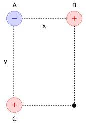 In the figure above, charge A is -5.00 nC, charge B is 10.0 nC, and charge C is 5.00 nC. If x = 2.10 cm and y = 4.20 cm, what is the electric field at the dot?