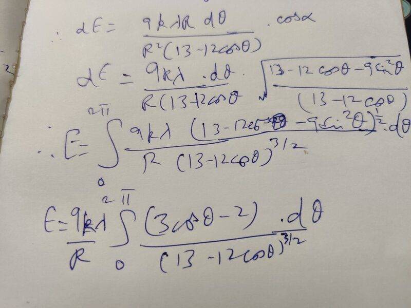 Similarly, the charges in bottom arc will result electric field vectors that will cancel each other perpendicular to line CP leaving us with a net electric field pointing radially outward along the line CP. This is shown in diagram.