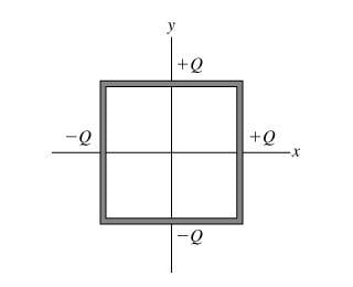 Electric charge is distributed uniformly along each side of a square. Two adjacent sides have positive charge with total charge + Q on each. Each side of the square has length a.