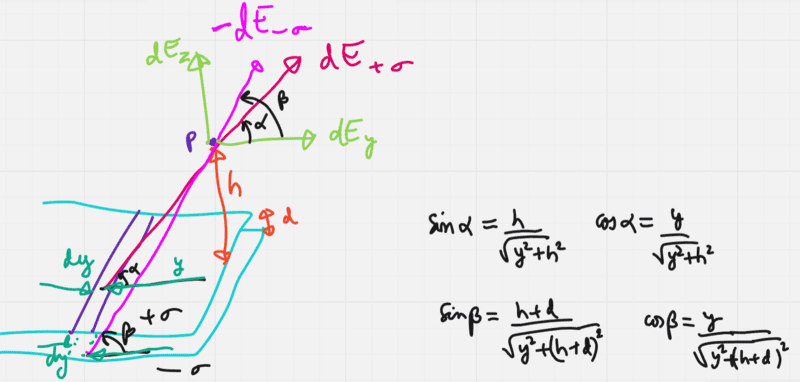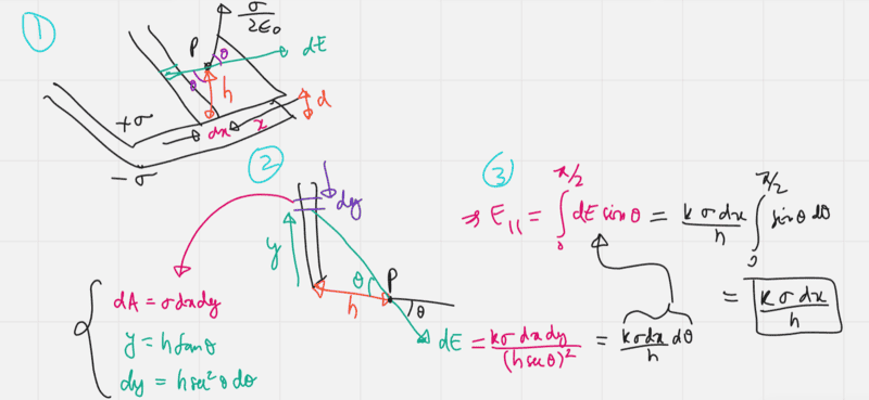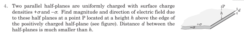 - Two parallel half planes are uniformly charged with surface charge densities ##+\sigma## and ##-\sigma## . Find magnitude and direction of electric field due to point ##P## located at a height ##h## above the edge of the positively charged half-plane . Distance ##d## between the planes is much smaller than ##h## .