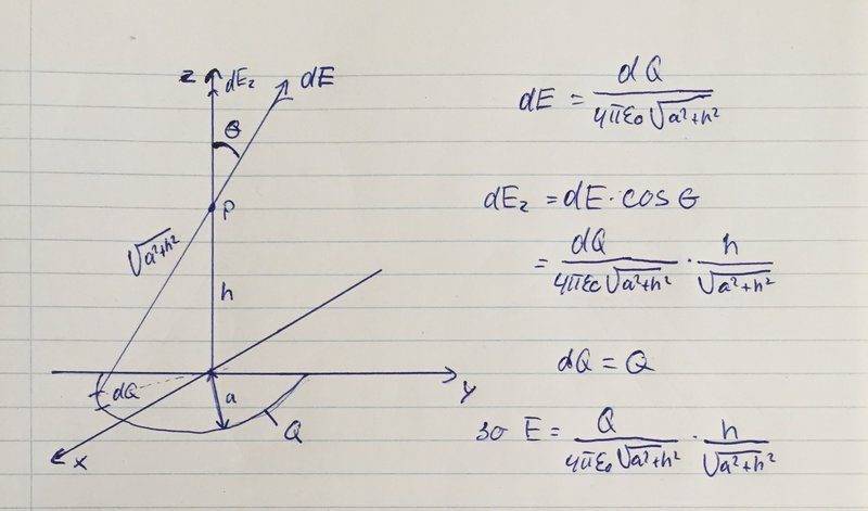 The discussion revolves around calculating the electric field produced by a semi-circular wire with a uniform charge distribution. The wire is positioned in the x-y plane, and the electric field is to be evaluated at a point along the z-axis, at a distance h from the origin, which is the center of the semi-circle.