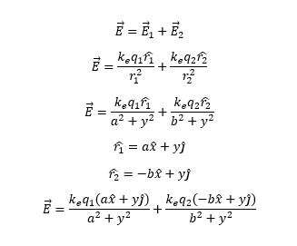The discussion revolves around the calculation of the electric field due to two point charges, focusing on the mathematical expressions and vector representations involved in the problem. Participants are exploring the relationships between unit vectors and the spatial dependencies of electric fields.