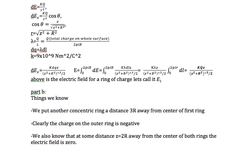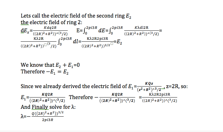 Derive the electric field a distance, z, above the center of a single uniformly charged ring of radius, R, with a linear charge density, λ. You are now given two uniformly charged concentric rings. The inner ring has radius, R, and carries a uniformly distributed total charge +[Q]. The outer ring has radius 3R and carries a uniform charge per length, λ. If the resulting electric field from the two rings is zero at an axial height of z=2R above the centers of the two rings, determine the value of λ.